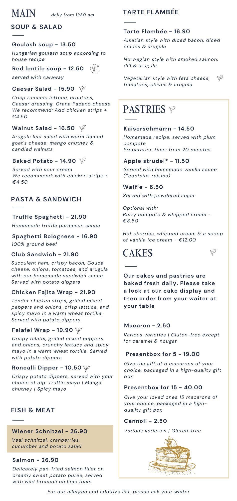 Enjoy our wide range of delicious breakfast options, hearty dishes, fine pastries, and homemade cakes.